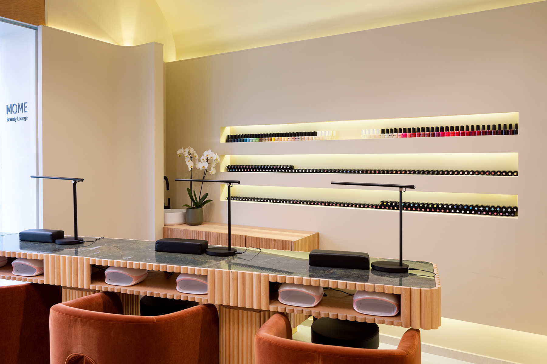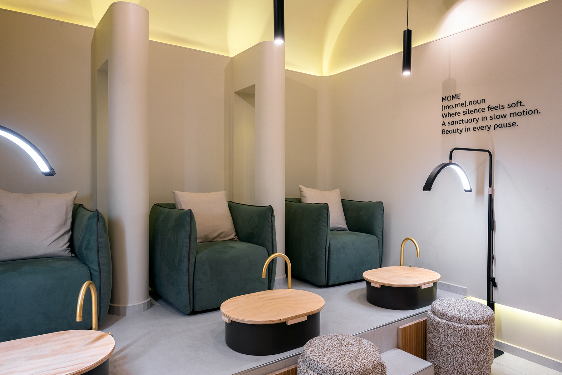 A soft, sculpted space designed to reflect calm, clarity, and care. Located in the heart of Rome, MOME Beauty Lounge was reimagined as a refined sanctuary where architecture enhances the experience of self-care. Natural tones, indirect lighting, and curved surfaces create a warm yet clean atmosphere, combining functionality with a sense of quiet luxury. Every element from custom furnishings to spatial flow was curated to reflect the client's vision: a beauty space that feels personal, intentional, and elevated.